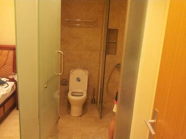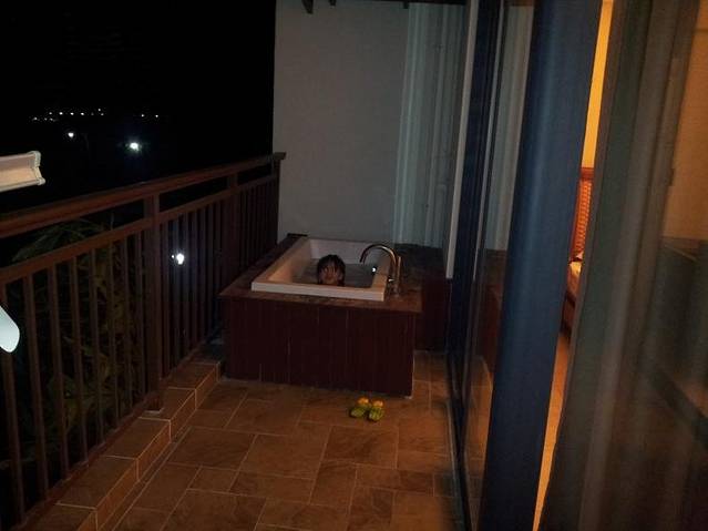 第二天早饭后在泳池里玩到中午退房,打了个的90块到三亚湾君然温泉度假酒店,这酒店是临时在淘宝上订的,心级景观房,300块每间,标的五星,其实硬件也就三四星吧,不过服务真的有五星。