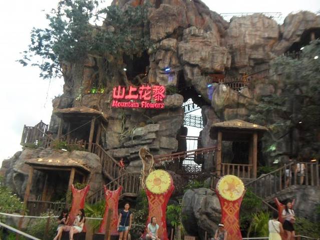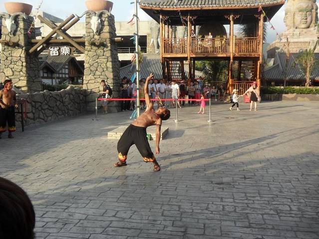之后赶紧到公交站等车去千古情,也是淘宝上团的,170每人,包接送。苗寨的黑哥在表演吃火,观众席坐满了人,还有好多老外。孩子最想去的鬼域,结果进去后排了半小时的队到我们时才被告知小孩不能进去,无奈老婆又带孩子去外面等我们,里面黑黑的,好多道具,有点点恐怖。