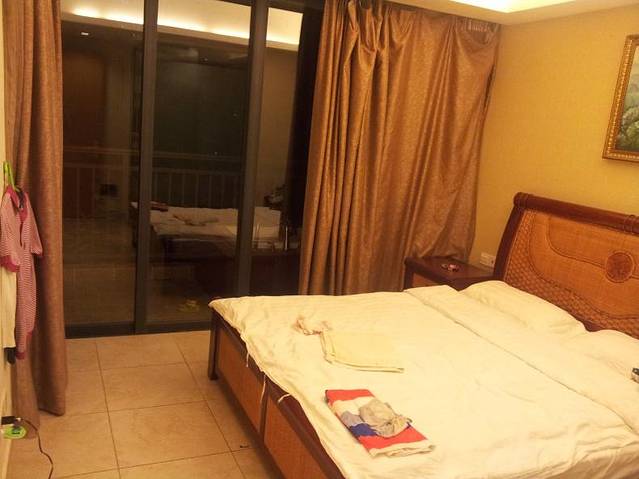 更倒霉的是坐在了鸡翅膀上,外面的景色看不到了,还好是晚上。到三亚22点多了,刚下飞机就是一股热浪袭来,还以为攀枝花就够热的了,比起三亚来小巫见大巫了,晕头晕脑的打了个的就到了三亚湾金中海蓝钻小区,才15块,这个家庭旅馆是淘宝上订的,便宜,228一晚,还是两室一厅的,刚好够一家人住,小区环境不错,还有免费的泳池