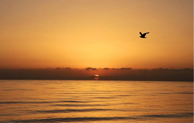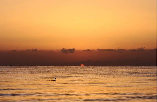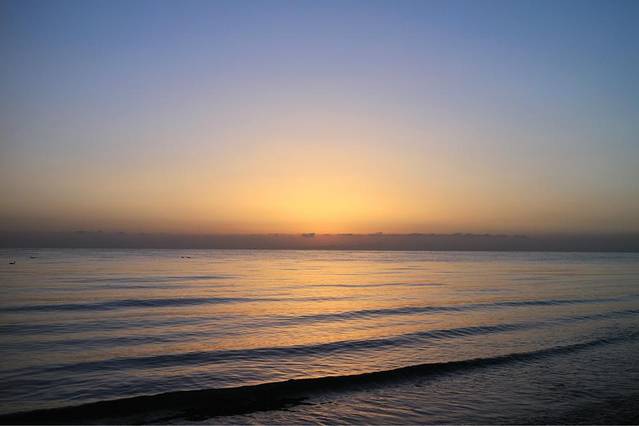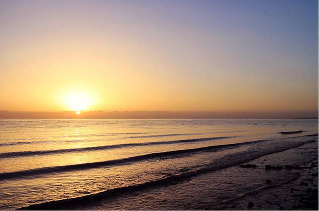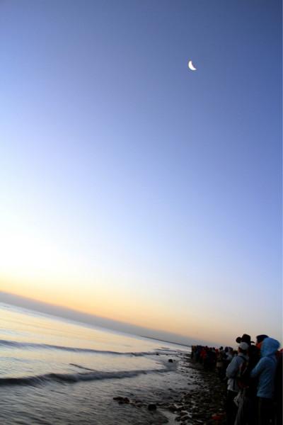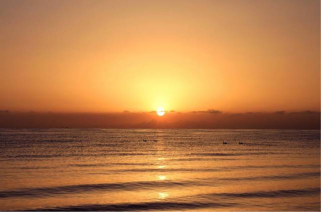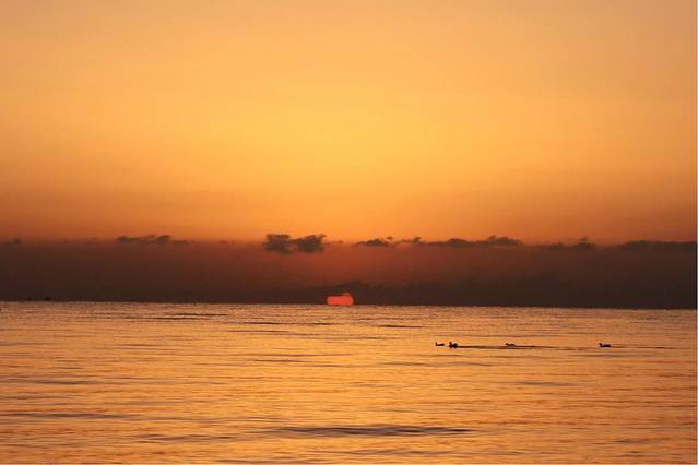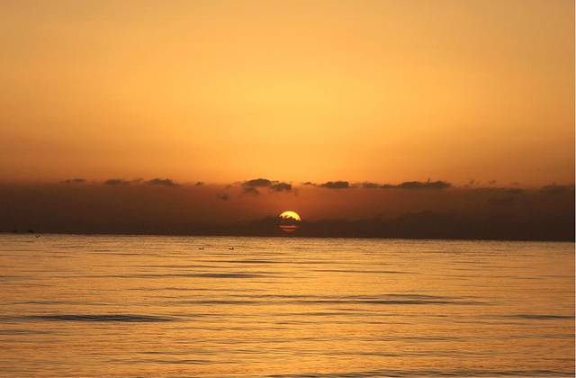 五点的湖边温度极低,我们去的还不算早,湖边早已站满了人,有些还是裹着棉毯出现在大家的视野中的,抵御寒冷不失为一个好办法,顿时觉得穿长裙的我俩真是勇气可嘉,直愣愣地立于湖边,拿着相机对准海平面只为等待那轮红日初升,外加时不时地跺脚取暖。