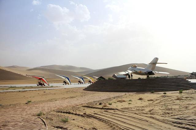 临近敦煌机场,映入眼帘的是一片较为平坦的黄色沙漠,机场竟然就建在沙地之上,着实教人惊艳了一回。