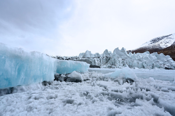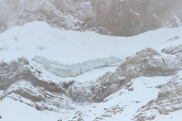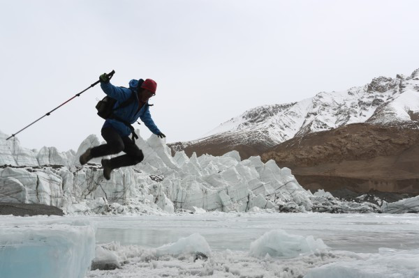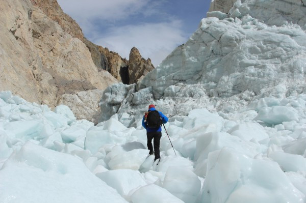 到达特拉木坎力冰川后,天气突然变差,狂风大作。我和汗斯简单的休息,吃了一些东西补充体力后,准备深入冰川,寻找通过的方式。之前的所有记录显示,来过克勒青的队伍,最多只到达过这个地方,影像资料也只是记录了特拉木坎力冰川正面的冰塔林。这里之所以困难,是由于特拉木坎力冰川的延伸,将克勒青河谷拦腰截断,冰墙直接与对面山体相接。驼队无法进出,之前的队伍也均原路返回。而我们计划此处,告别驼队,重装行进,跨越冰川继续向克勒青河谷上游挺进。在没有资料参考的情况下,我们要寻找最可行的方案。因此我和汗斯深入的每一步,都是克勒青穿越的进步,每一步也许都是人类的第一步。