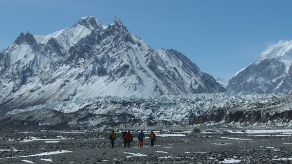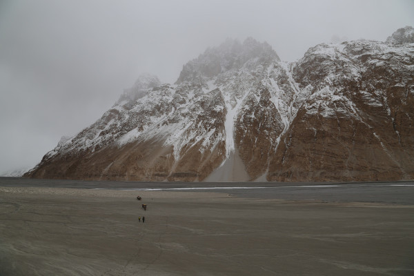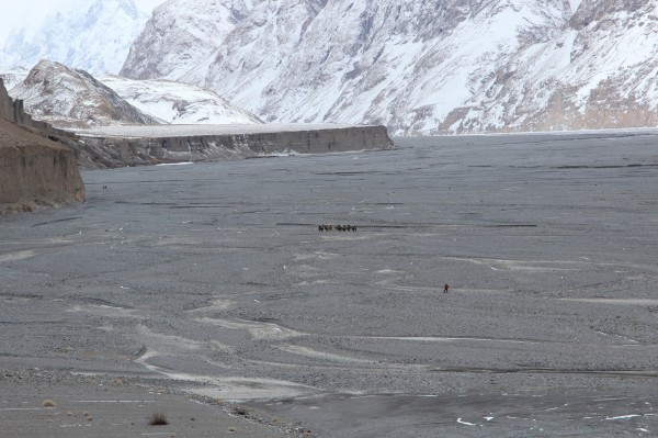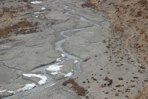 迦舒布鲁姆冰川深入克勒青河谷,这里形成了一个大拐弯,即使是这个季节,河道的水流也非常湍急,这里我们需要借助驴子渡河,如果进入丰水期需要借助骆驼,并且有危险性。