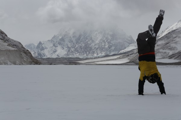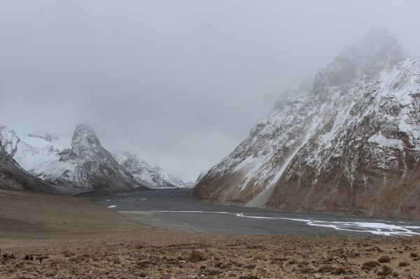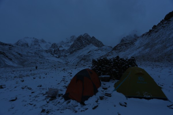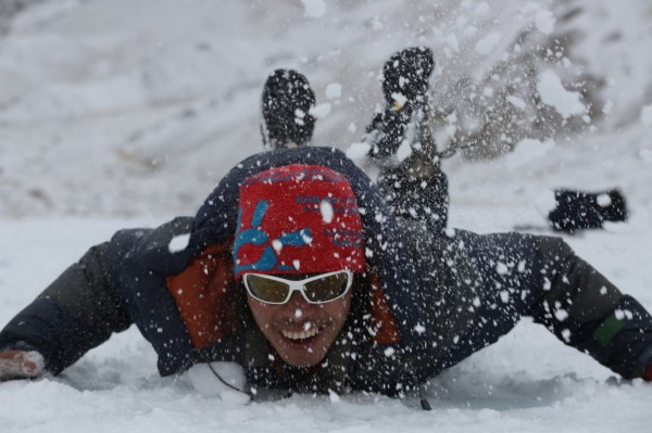 晚上下了一整夜雪,在帐篷里随时可以听到山体落石滑坡的声音,由于今天路程漫长,要翻越阿格拉达坂真正进入克勒青河谷,上升600米下降900米,看天气情况达坂上积雪一定很厚,因此出发比前两天要早将近两个小时。我们从一号羊圈下到河谷,进入正确的岔口,看到大片的冰河,我们在冰河上玩滑行。