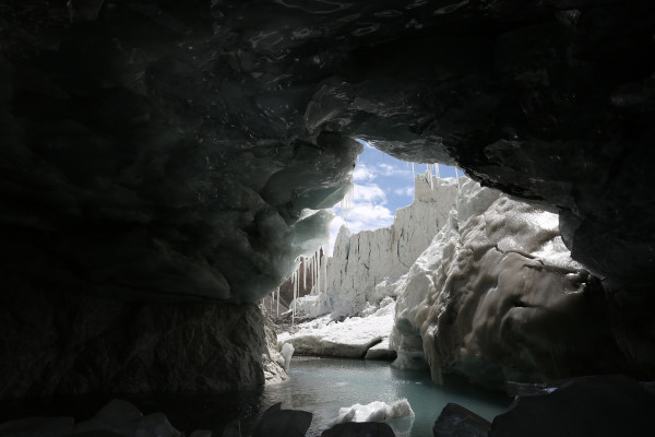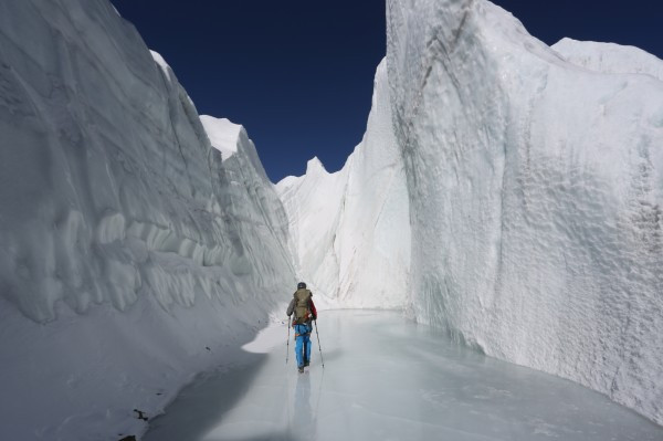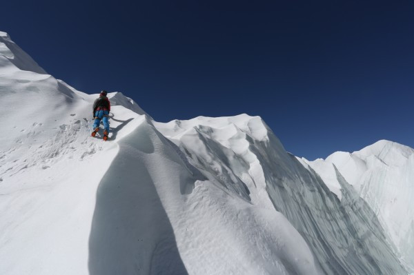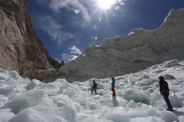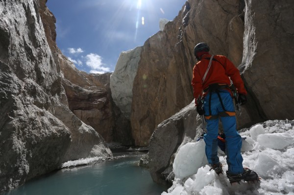 跨过碎冰,来到了暗河和悬冰川处,开始尝试涉水通过暗河。上方落石落冰的可能仍然很大,虽然带了头盔,但是安全也是无法完全保证的。
