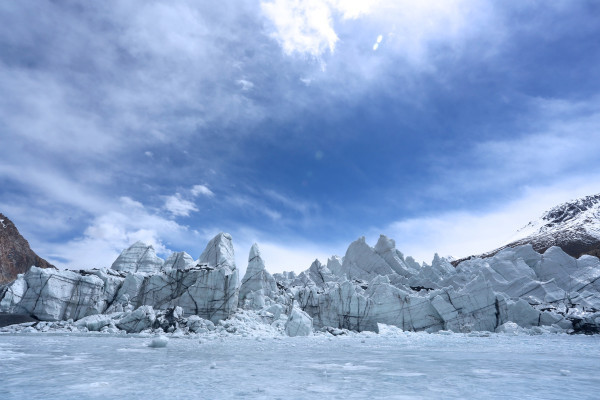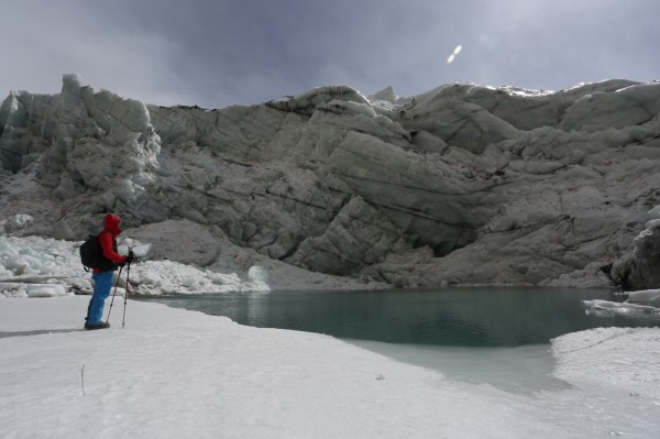 我们慢慢向冰川与山体相接的地方行进,特拉木坎力冰川巨大,走了将近两公里都没能到达它和山体相接的地方。我们考虑到整个队伍的整体情况,此时更倾向与从冰川与山体相接出想办法通过,不愿意横跨冰川,毕竟冰塔林立,重装横穿将非常困难。冰墙下有很多小型冰湖。