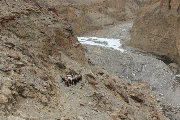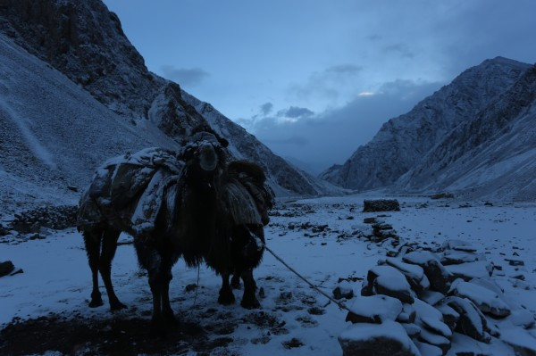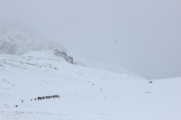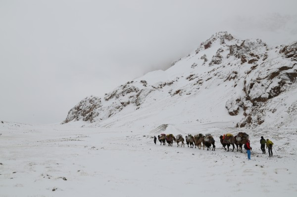 在之前Google earth上做功课,阿格拉达坂这边应该有一个湖,大雪之后,湖已经不见踪影。接近达坂的地方有一块巨石(下图驼队前方),很难想象那个位置会出现巨石,不知道是何年何月冰崩石裂让它成为了阿格拉达坂的一个标志。雪后的阿格拉达坂走起来有点绝望。