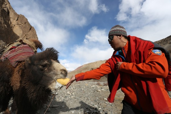 整个队伍之前制定了每天大约的行程与扎营地点,但是与驼工沟通后,骆驼在我们之前规划的一些营地没有足够的草料,而且水源也是问题。因此前半段的行程及营地的选择,我们只能完全听从驼工的安排,即使这样在这个季节高海拔地区,也很难满足骆驼食物的供应,基本每天驼工还会单独给骆驼补充食物,食物是由玉米面和水搅拌而成,我们都很热衷喂骆驼。