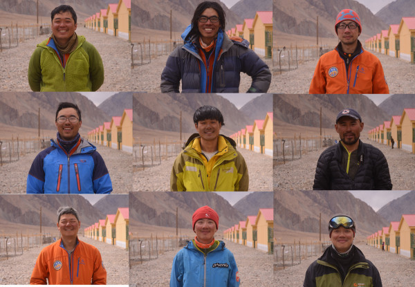 此次活动在队员的选择方面,非常多样化,千日寻峰的理念就是带领更多人探寻未知山峰冰川,因此并没有片面的完全选择经验非常丰富的户外达人,而是在顾及安全的前提下尽可能的选择了不同生活经历的队员,发起者4人,参与者4人,极致玩家栏目组导演和摄影2人,队伍总计10个男人。(下图,一排从左至右分别为:颜波切、春石、默涵、无存、小红、昊昕、田纳西门;二排从左至右分别为:小兰、汗斯、小北。)