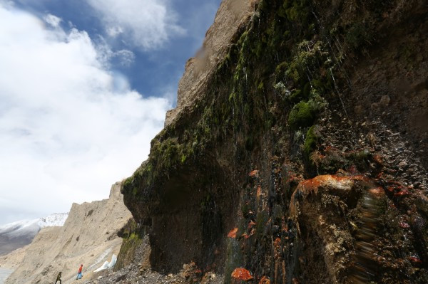 这张对比很明显,只有水帘洞的那部分是绿色,其他地方都是沙石,水落到地面上以后就会结成冰块。绿色的苔藓,白色的冰块,黄色的沙土,还有红色的一个二货,哈哈。