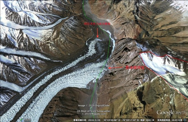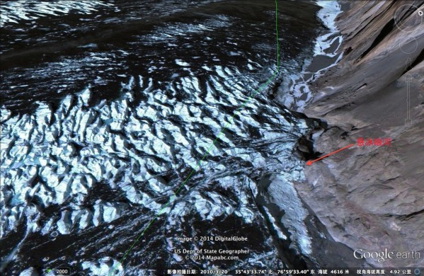 这张图是突破性的,已经走过暗河,对面河谷开始变的宽阔,从Google Earth上观察之后的河谷不再完全被冰川堵死,因此从这里是可以穿过特拉木坎力冰川的。