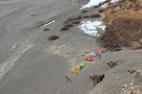 刚下到河谷,没多远遇到一个牧场,驼工示意这就是今天的营地,比我们的计划要少走很多路程,牧场不小,紧邻河道。头一天行走路程又短,很轻松的完成。