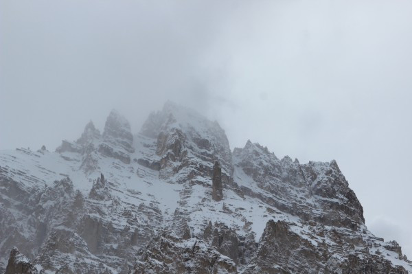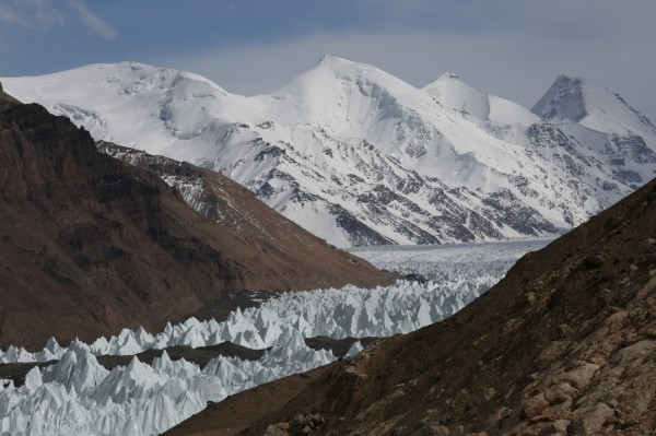 在翻越达坂的过程中,喀喇昆仑山脉已经开始给我们展示他的险峻了,周围的山峰没有任何植物可以依附其上,山体破碎悬冰川比比皆是,山顶被风化的如插满了根根利剑。