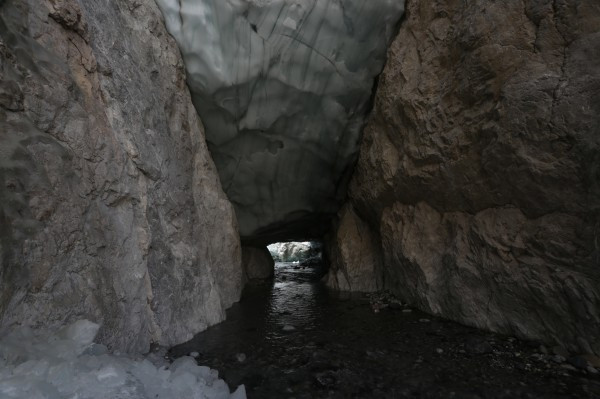 我们逐渐看到冰墙与山体相接的地方,最初我们还是认为冰墙没有完全把路堵死,但是之后转过弯,冰墙完全顶到对面山体。