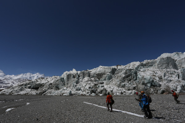 昨天冰况不稳定,时间也不充裕。于是今天整个队伍对特拉木坎力冰川进行更详细的考察。评估了两条路线穿越的可能性安全性。其中一条通过暗河,另外一条直接横跨冰川。