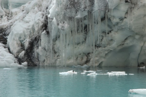 冰湖很漂亮小巧,冰挂珠帘一般,这个冰湖浮冰上有一只小鸟在那里自己找乐子,跳来跳去,很生动。