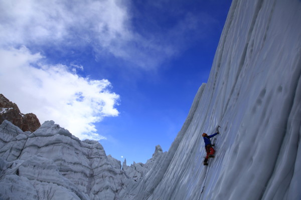 冰墙与山体相接处,都是崩塌下来的碎冰,我和汗斯的冰爪都在后面的驼队身上,不得不直接上冰。