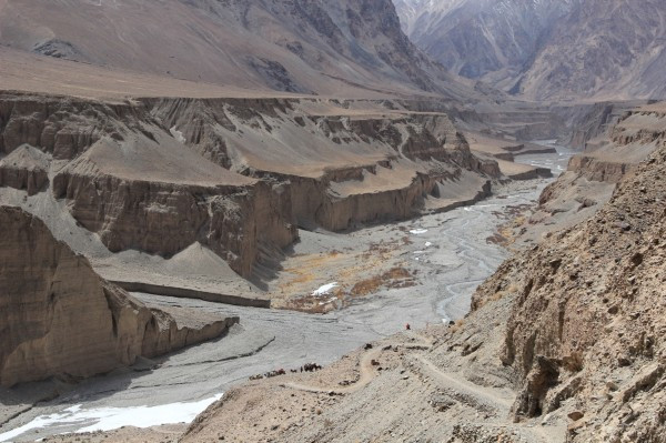 继续沿小路行走,引导我们走向河谷底部,河谷蜿蜒宽阔,此时还没有真正进入克勒青河谷,但已经非常壮阔了。可以看到驼队在河谷中是有多么渺小。我们选择这个时间段进行穿越,也是考虑到此时河谷内水量较小,一旦丰水期,河谷如此宽阔,我们将很难解决频繁渡河的困难。