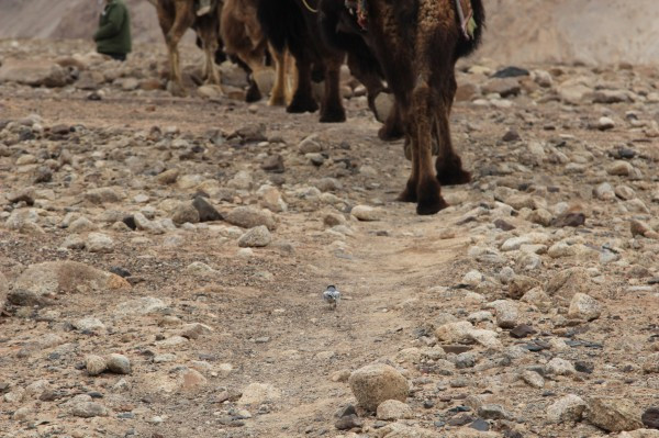 翻过阿格拉达坂之后一路下坡,下降将近1000米,均是沟坎乱石,坡度比上升时大很多,一路无心照相。直到克勒青河谷突然出现在眼前。真的很难简单的用宽阔来形容,下图衍生的方向就是我们要穿越的克勒青,他的反方向就是中国一侧进入K2大本营的路线。进入K2大本营的队伍不多,进入克勒青河谷的队伍就更少了,更不用说完整穿越克勒青河谷。现在开始就是人迹罕至的地方了,这边的鸟看到我们都好奇,尾随着我们的驼队。我们真正的探索刚刚开始。