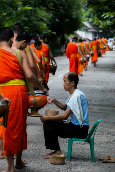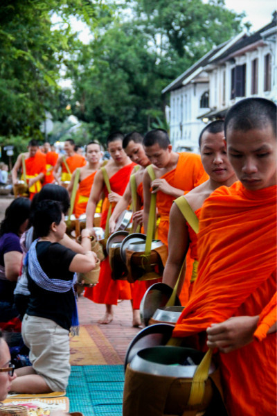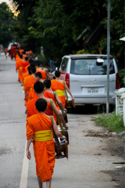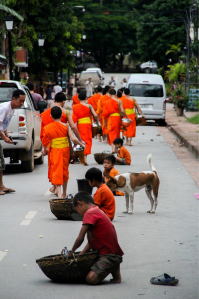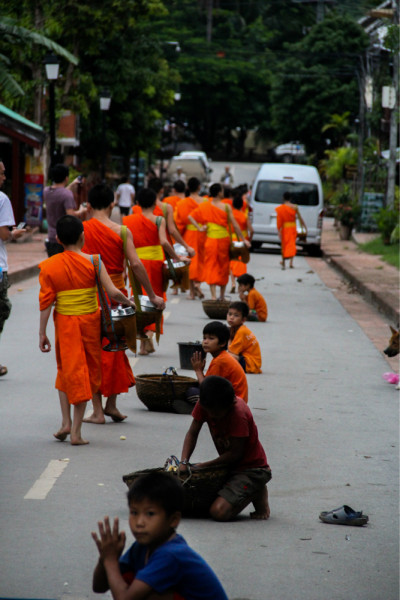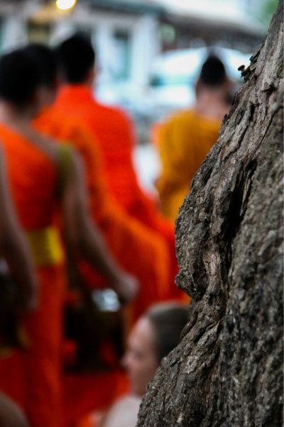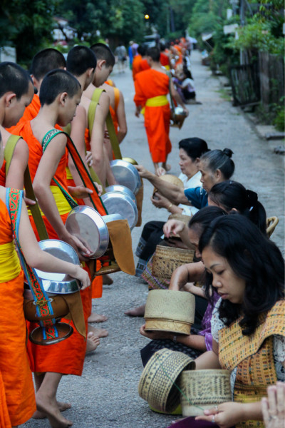 琅勃拉邦之所以为琅勃拉邦,除了美丽的风景,还有保留的很好的人文风景,布施就是其中之一。早晨看着一片橙色的队伍迎面向你而来,街道上静静的,和尚们接受着虔诚的信徒们的布施,仿佛那时候心里渐渐明白了原来这就是信仰的力量。在这种环境的渲染下,心里产生一阵莫名的感动,那种感觉无法用文字形容,只有亲身见证才能感觉的心灵震撼。