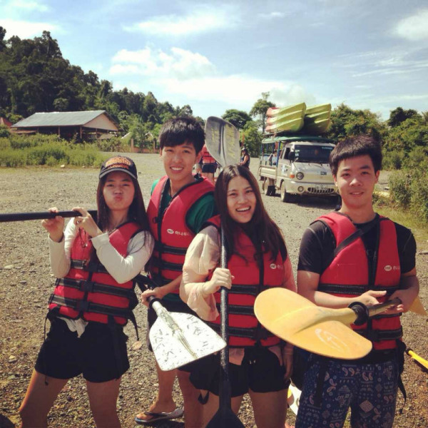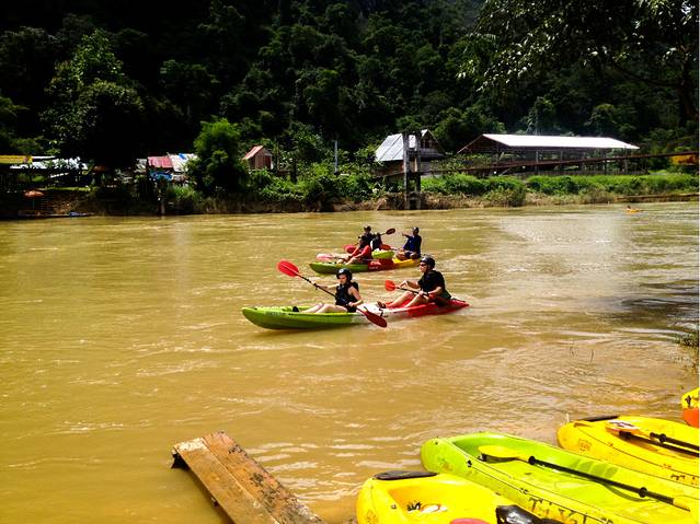 我们首先被送到漂流的起点,10几个人先分了队,我被分到了和澳大利亚大叔一队,他叫丹尼尔,看样子有一把年纪了,所以他老是不撑船我来撑。先划船几公里,然后徒步去两个山洞,在其中一个山洞轮胎漂流,要自己拉绳索进洞里好刺激。另一个山洞就有点坑爹了,就看一个很像大象的石头,就出来了,再继续KAYAKING,一直滑到终点,不过中途会休息几次。途中有的地方水流很急,小康和老刘掉了3次,文娟掉了1次。我看到把他们都吓得脸都白了。