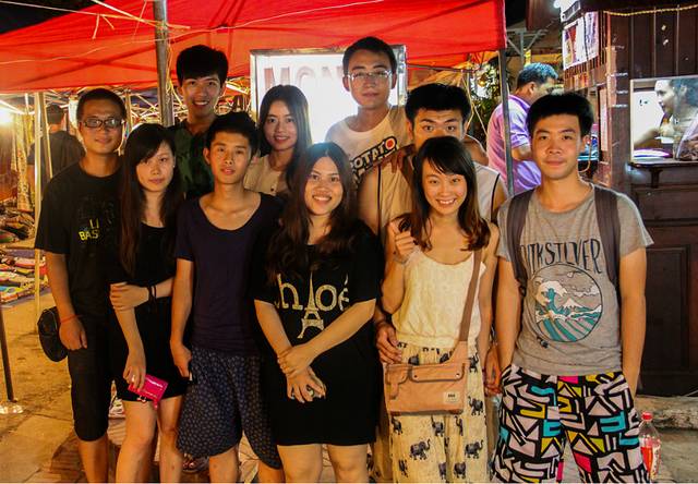下午四点多就下来回去市区了。回去洗了个澡。又去夜市溜达觅食。由于真的没什么东西吃,只能吃会昨天的自助餐了,再吃的感觉是。。。。难吃。琅勃拉邦是在是太小了,一天能遇到同一个人好几次。吃东西的时候又遇到羊羊他们了。他们明天就离开这里了,于是我们这群人就来了一张合照。