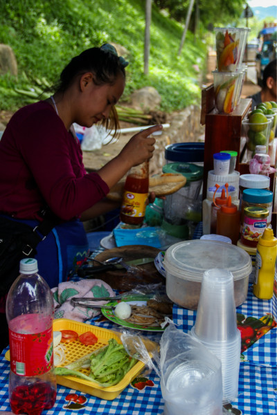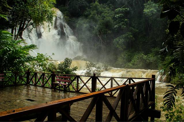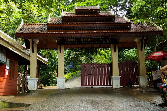 原来羊羊他们已经集结了很多人了,一起去考安西瀑布。我们每人4万KIP来回加门票。在那里买了条法棍当午餐就开始了半天的瀑布之旅。老板娘很不爽我们,羊羊把法棍从一万KIP讲到六千KIP。