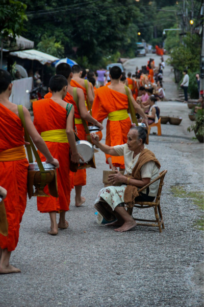 和尚们接受别人施舍的同时,也在帮助者有需要帮助的人们。他们不会把自己的东西放到有需要人们的篮子里,这些孩子都会双手合十表示感谢。