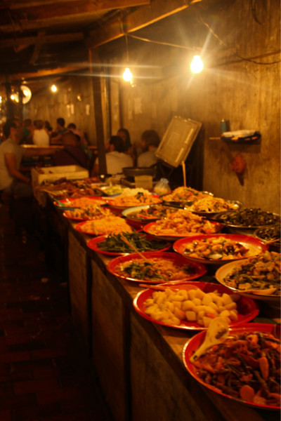这在洋人街夜市的一头,就叫它自助餐一条街吧。全部1万KIP,不过只准剩一次。不算好吃,但是对于我们这群好久没正常吃过东西的人来说,已经算是美味了。吃完东西有点晚了,就回去睡觉了,明天跟他们约好了一起去考安西瀑布,这也算是被他们捡了吧。