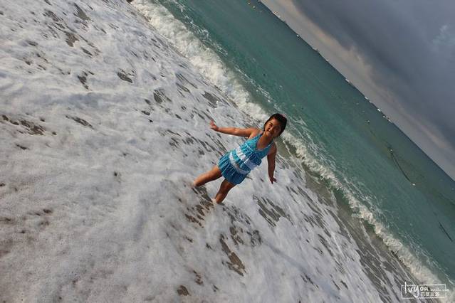 傍晚:去大东海游泳被浪花拍在沙滩上