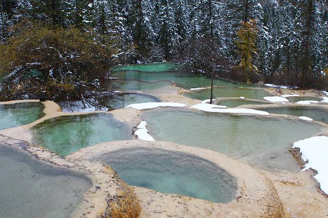 黄龙,因其内的“黄龙寺”而得名。高山雪水和涌出地表的岩溶水交融流淌,随着流速缓急、地势起伏和枯枝乱石的阻隔,水中富含的碳酸钙开始凝聚,发育成固体的钙化埂,使流水潴留成层叠相连的大片彩池群,绘出了奇观的第一幅天然图画。碳酸钙沉积过程中,又与各种有机物、无机物结成不同质的钙化体,还有光线照射的种种变化,形成池水同源而色泽不一,人们便称它为“五彩池”。黄龙景区门票200元。