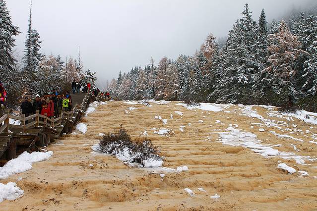 金沙铺地海拔3305米,水中的碳酸盐在这里失去了凝埂成池的地理条件,漫坡的水浪,在长1300米,宽40-120米的脊状斜坡地上翻飞,并在水底凝结起层层金黄色的钙华滩。