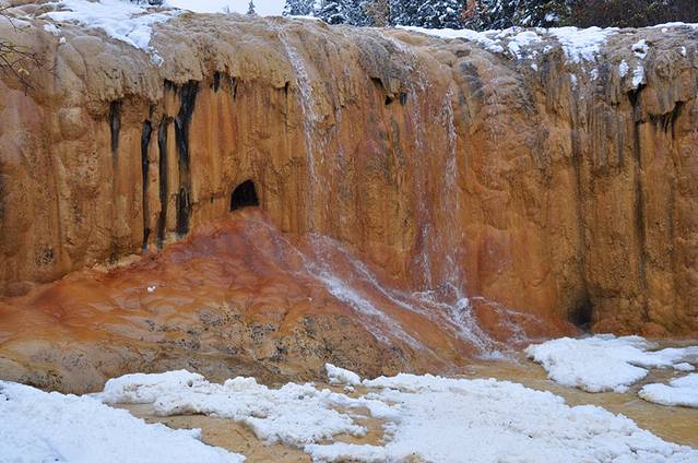 洗身洞瀑布 海拔3280米,在高10米,宽40米的钙华塌陷壁上有高一米、宽1.5米的溶洞,名曰洗身洞,传说该处是仙人净身修道的地方。奔涌的水流在钙华壁跌宕成一道金碧辉煌的钙华瀑布,十分壮观。