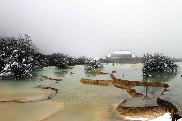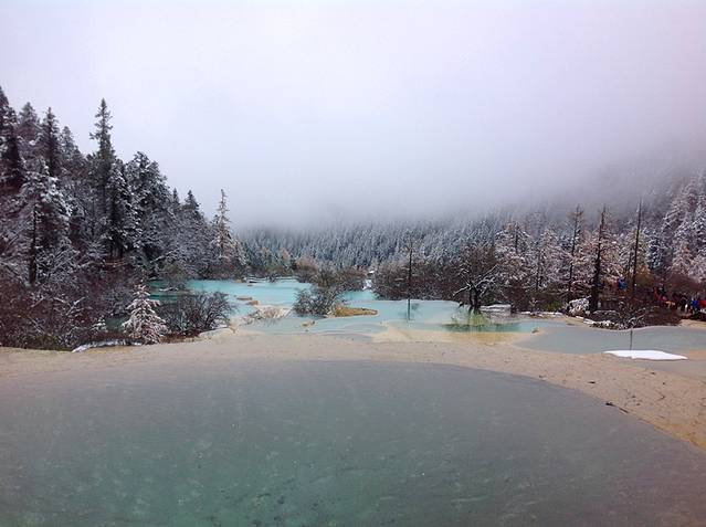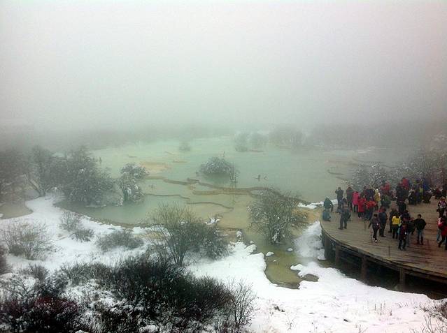 车子中途休息了一次,当再次踏上行程的时候气雾了,能见度很差,车子不仅开的慢,而且想着黄龙一片大雾还能看到什么风景啊,心情有点沮丧。不过下雪的黄龙估计会有不一样的景致,想到这点又觉得很幸运,因为在九寨沟还是深秋的季节又欣赏到黄龙的冬景。