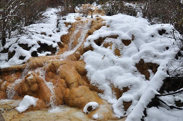 黄龙古寺到黄龙中寺中间的景致也很美,固化的钙化埂像瀑布一样