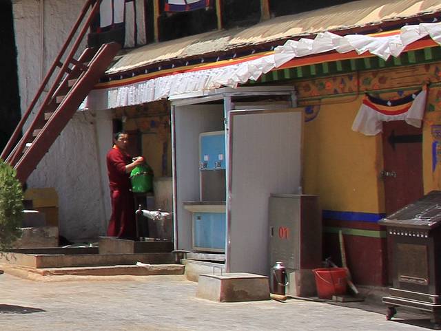 我们入住了140元一晚的标准间(携程等旅游网站网上预订反倒要200多元),只是窗外对着一条巷子,没有景观可看,但价格便宜了一半还多,还含早餐。最重要的,是房间的wifi信号很强,上网相当畅顺;热水也好,洗澡无忧。早餐要9点才开饭,有稀饭、豆浆、鸡蛋、馒头、榨菜,虽说简单了些,但吃起来还是蛮舒服。六楼平台有好几台洗衣机,免费提供给住客使用。感觉好,所以我们在吉雪卧塘宾馆连住了三天,直至离开拉萨。