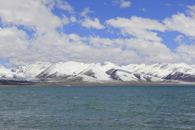 洁白的雪山与湛蓝的湖水融合在一起,同蓝天白云交相辉映