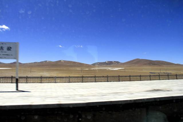 中午12时16分,列车将通过唐古拉车站,我举起照相机准备抢拍,不料此时列车员来到我们卧铺组喊我倒垃圾,起初我正聚精会神地望着窗外没理她,可她连着喊了几声,我只好回头朝她指了指手中的照相机……这一回头不要紧,错过了拍摄唐古拉站的最佳时机,只拍到了个模糊的站楼和半个站牌……