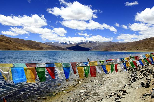 从自然景观来说,纳木措最大的特色,就是洁白的雪山与湛蓝的湖水融合在一起,并且同蓝天白云交相辉映。