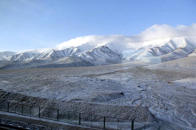 摄于6∶53,天已经亮了,列车此时已经进入了昆仑山脉。从车窗向外张望,山上、地下都像打了霜似的,白皑皑一片……