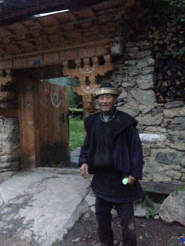 还没找到大部队就下起了小雨,我在往回走的路上看到一位穿着藏服的老爷爷站在他家大门口,于是我上前询问是否能给他拍一张照片,结果老爷爷什么都听不懂,最后我拿着手机比划了半天,老爷爷点了点头,很配合的冲我笑~