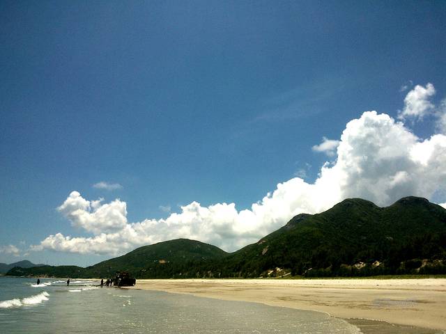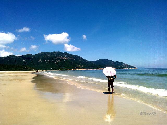 下船后直奔飞沙滩!正值中午12点,还是有些家庭趁着人少下海。虽说烈日当空,不过蓝天边云,无边蔚蓝的大海依旧深深震撼着我。