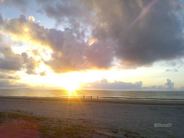 清晨6点15分,一轮红日从海上冉冉升起,顿时映红了天空中的云彩和海滩,远处山上风力发电厂的大风车也染上了一层淡淡的霞光。