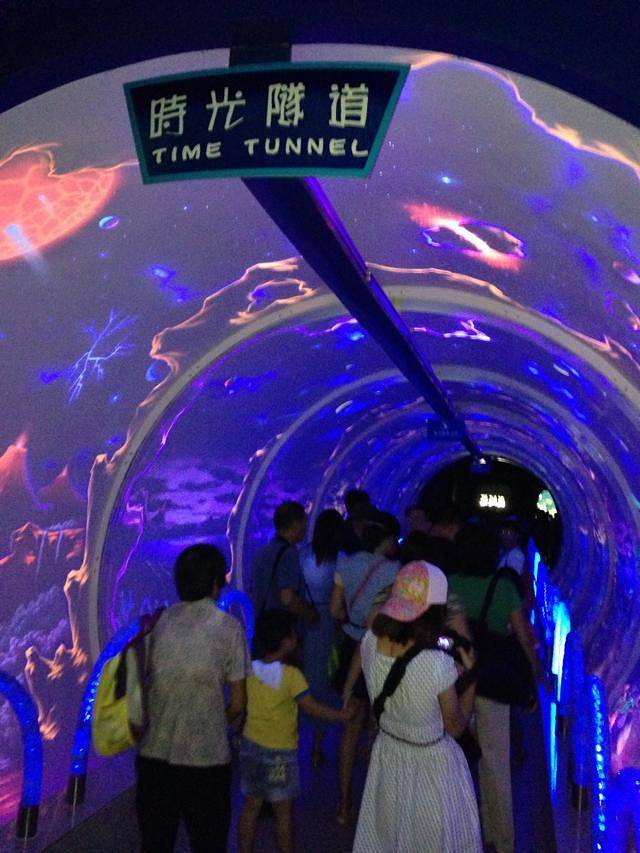 时光隧道,是国内绝无仅有的荧光纯手工壁画,由日本著名荧光画大师远山先生花了3个多月画成,价值超三百万元。整个壁画描述了海洋形成、发展过程和未来的遐想,即海洋的昨天、今天和未来,在这里你可以完全放飞你的想象;该壁画另一奇妙之处:如果关闭荧光灯,壁画会变成一面白墙,什么也不见,但是打开荧光灯后,画面栩栩如生,层次分明,你不得不惊叹大师的高超技艺。穿过时,身上如果穿着白色衣服,衣服会呈现出荧光状态,十分漂亮。