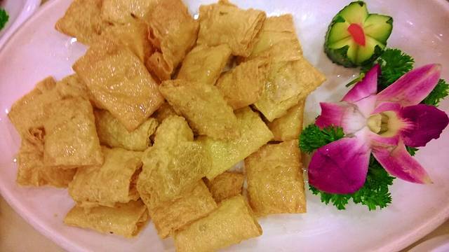响铃,脆脆的,其实就是油炸豆腐皮,蘸番茄酱吃~~,