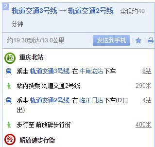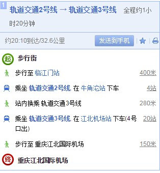 据说是重庆作为直销市所以到达其他地方的机票都会便宜很多,所以选择了从成都-重庆-杭州的策略,这样算下来比直接从成都出发费用少了接近200块,坐的早晨的动车到达重庆北站,本来没打算在重庆过多逗留直接去机场候着,但是忽然在动车上重庆的朋友看到我发的微信。于是又在重庆解放碑附近玩儿大概4个小时左右,再乘坐轻轨到达飞机场,大概需要一个小时左右。图片中有详细的乘车线路,百度上都能找的到很方便。