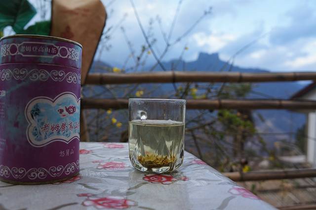 老姆登姐妹花客栈里的茶和远处的皇冠峰(?)