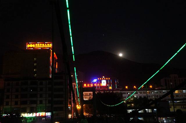 夜间的六库大桥,江两边有很多小吃摊