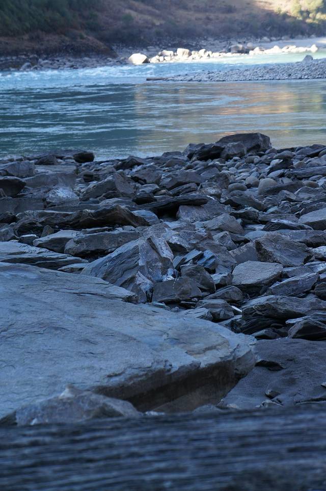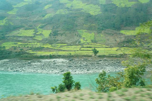 冬季的怒江是湛蓝湛蓝的~两岸的上坡基本都被勤劳的人们开垦成了田地~