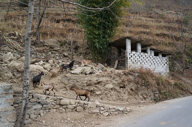 老姆登山下村子里会自己回家的羊群